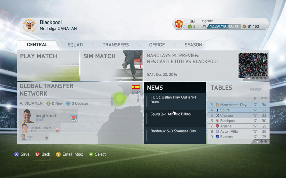 Sol üst bölümde maç başlatım simulate etme seçenekleri mevcut. Bu bilindik seçeneklerin hemen altında büyükçe Global Transfer Network penceresini görüyoruz. Sağ üst bölüme yatay konumlandırılan pencerede ise basına yansıyan haberleri görmemiz mümkün. Burada öne çıkan haberler listelenirken hemen altında global news dediğimiz daha geniş çaplı haberlerin listelendiği menümüzü görüyoruz. En sağ altta ise fikstüre göre değişen sonuç tablosunun özeti bulunmakta. Örneğin sıradaki maç lig maçı ise lig tablosu, kupa maçı ise kupadaki son durumlar burada görüntüleniyor. Tabloların detaylı görünümü için üzerine tıklamamız gerekiyor. Central bölümü maça girmeden önce, maç bittikten sonra ya da son durumlar nelermiş bakayım diyebildiğiniz hemen her önemli bilginin özetlendiği bir bölüm. Dolayısıyla bir çok işlemi fazladan sayfa açmadan buradan kontrol etmeniz mümkün.