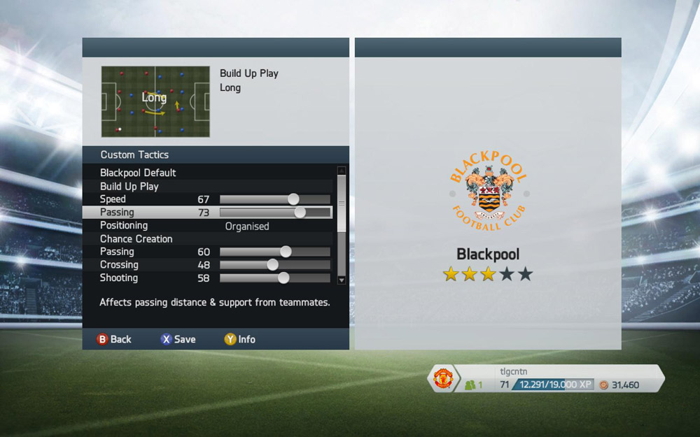 Başarılı menajer olabilmenin ilk yolu takımını tanıyabilmektir. Oyuncu özelliklerinde oynadığı mevkiler yazıyor olsa da iyi tanımadığınız oyuncuları doğru mevkisinde bile yanlış oynatabilirsiniz.  Öyle ki, defansif sol bek ile ofansif sol bek oyuncularını iyi seçemediyseniz, kötü giden bir maçı kanatlara yığmakta da zorlanacaksınız. Bu tip strateji hataları yapmamak için lig başlamadan önce üşenmeyin ve önünüze çıkan hazırlık maçlarını tek tek yapın. Hemen her oyuncuyu deneyin. Hangisi yavaş hangisi daha hızlı kendiniz keşfedin. Lige etkili başlamanın ötesinde sizi oyuna bağlayan etkenlerden birisi de budur… Squad menüsüne tekrar dönecek olursak, sol tarafta genişçe takım yönetimi penceresinin konumlandırıldığını görüyoruz. Bu pencerenin (karenin) üzerine gelip sağ analog ile hızlı taktik değişiklikleri yapabilirsiniz ancak oyuncuların mevkilerinde değişiklik yapmak istiyorsanız üzerine tıklatıp taktik ekranını açmanız gerekiyor. Burada yapacağınız tüm taktikler, oyuncu dizilimleri, duran top kullanıcıları, kısacası tüm takım ayarları kalıcı olacaktır. Herhangi bir maçı başlatmadan önce gireceğiniz taktik ekranı ise sadece o maça özel olacaktır. Dolayısıyla tek maçlık oyuncu ya da taktik değişikliklerini maça başlamadan önceki ekranda yapmanızı tavsiye ederim.