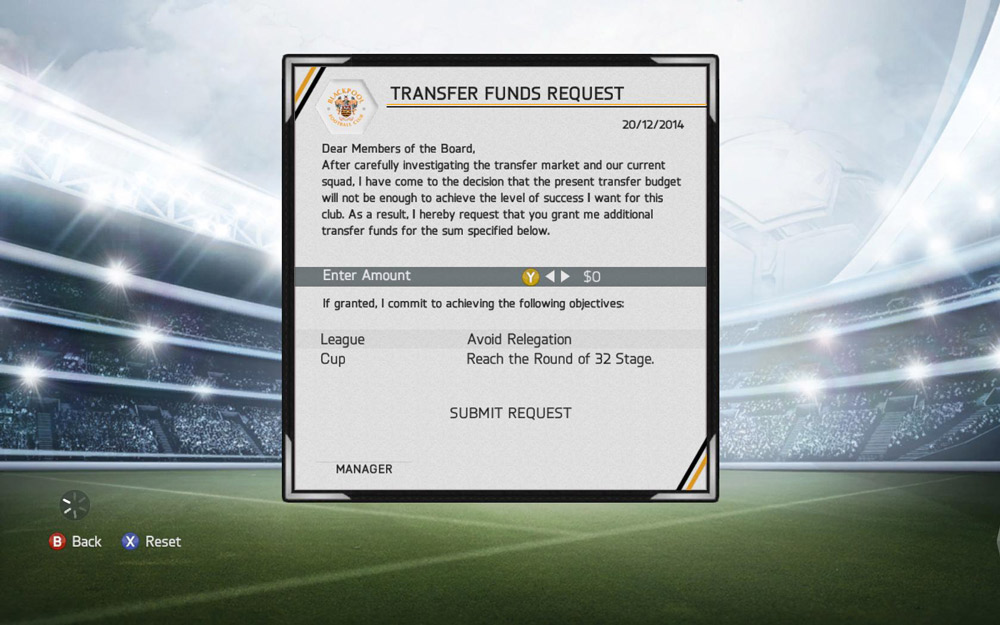 Düşük bütçeli takımlarda – yukarıda da bahsettiğim gibi- genç oyunculara yönelmelisiniz. Çünkü bir çoğunun çok ucuza alıp yüksek fiyatlara satabiliyorsunuz. Tabii bunun için sabırlı olmanız gerektiğini de hatırlatayım. 16 yaşındaki bir oyuncunun bir sene içinde World Class seviyesine gelmesini beklememelisiniz. Bu arada takım bütçesi demişken mevcut bütçeniz sizi sıkıntıya sokuyorsa ya da çok acil maddi kaynağa ihtiyaç duyuyorsanız klüpten fazla kaynak isteyebiliyorsunuz. Bunun için de Request Funds seçeneğini kullanıyorsunuz ve klüpten istediğiniz miktarı girip onaylıyorsunuz. Klüp de size olumlu ya da olumsuz bir cevap veriyor.