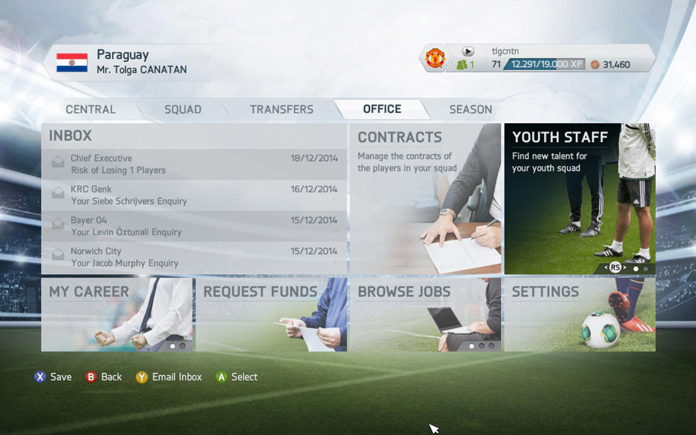 Antrenmandan çıkıp siyah takım elbiseyi giydiğiniz anda ne yapabiliyorsanız bu ekranda da onları yapıyorsunuz. Güzel bir duşun ardından orta şekerli kahvenizi alıp bilgisayarınızdan maillerinizi kontrol edebilirsiniz. Gerek ekibinizle, gerek oyuncularınızla gerekse de diğer takımlarla iletişim tamamen e-posta üzerine kurulu olduğundan maillere gereğinden fazla önem vermeniz gerekiyor. My Career seçeneği altında kendi istatistiklerinizi görüntüleyebiliyorken, Objectives bölümünde klübün size verdiği hedefleri kontrol edebiliyorsunuz.