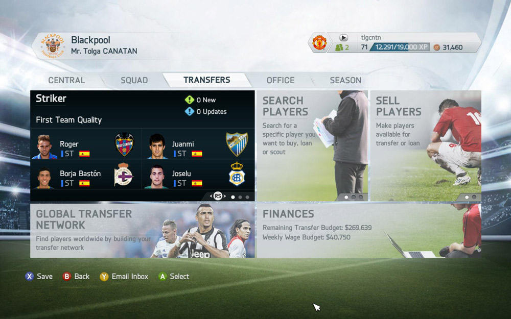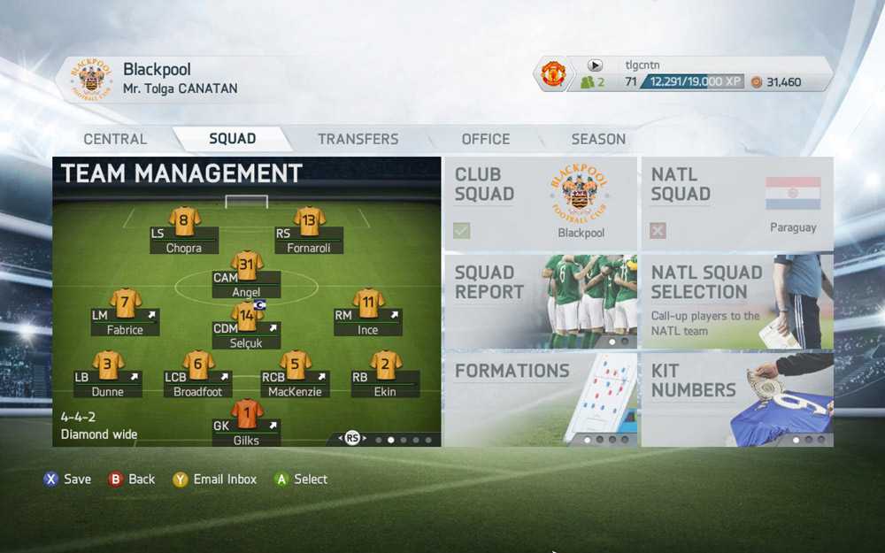 Hangi menüden hangi işlemleri yaptığımızı bilirsek geriye bizim menajerlik becerilerimiz kalır diye düşünüyorum. Oyunda beş adet ana başlığımız var. Bunlar üst bölümde şu şekilde sıralanmaktalar, Central, Squad, Transfers, Office and Season. Bu ana başlıklar sekme mantığıyla yerleştirilmişler ve her sekmeye ait alt başlıklarımız mevcut. Bu alt başlıklar arasında ilgili olanlar tek karede toplanmışlar. Dolayısıyla bir karede birden fazla başlık olabiliyor. Bu başlıklar arasında geçiş yapmak için sağ analog çubuğunu kullanabilirsiniz. Klavye oyuncusuyum diyorsanız da numpadden 4-6 ile aynı geçişi yapabilirsiniz.
