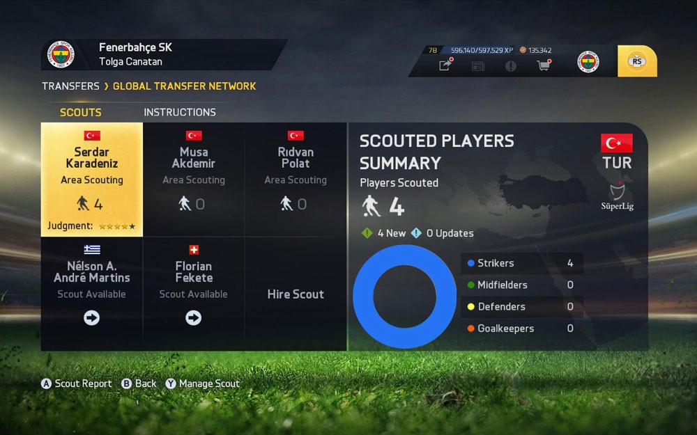 Diğer liglerdeki tanımadığınız oyuncuları takip etme imkanımız olmadığı için bize bu konuda yardım eden insanlar var. Bu insan topluluğuna Scout deniyor. Scout’unuzda bulunan takım arkadaşlarınızın her biri kalitelerine göre size oyuncu araştırıp öneriyorlar. Ne kadar kaliteli personel çalıştırırsanız o kadar iyi oyuncu buluyor ve siz de boşuna zaman kaybetmemiş oluyorsunuz. Scout personellerinin kaliteleri ise 5 yıldız üzerinden değerlendiriliyor. Aynı anda toplam 6 personeli istediğiniz bir ülkeye gönderip o topraklarda koşturan futbolcuları araştırmasını isteyebiliyorsunuz. Tabii oyunda olmayan bir lige ait ülkeye gönderemediğinizi de söylemek gerekir. Scout’un getirdiği oyuncuların özelliklerini net olarak göremiyorsunuz. Yani size Fernandao isimli bir oyuncu önerildiyse bu oyuncunun takımı, ülkesi yaşı vb temel özellikleri görüyorsunuz ama örneğin long pass değerini net olarak göremiyorsunuz. Çünkü scout size diyorki, ‘bu oyuncuda ışık var. Şu ve bu özellikleri 75-90 arasında, bu ve şu özellikleri ise 45-60 arasında. İstersen biraz daha derinlemesine araştırıp kesin sonuç getiririm.’ diyor. Sizde ışık gördüğünüz futbolcular için bu isteği kabul edebiliyor ve o futbolcunun en net özelliklerini görebiliyorsunuz. Biraz önce bahsettiğim scout kalitesi burada da ortaya çıkıyor. Scout ne kadar kaliteliyse, sonuçlar da o kadar hızlı ve gerçeğe yakın geliyor.